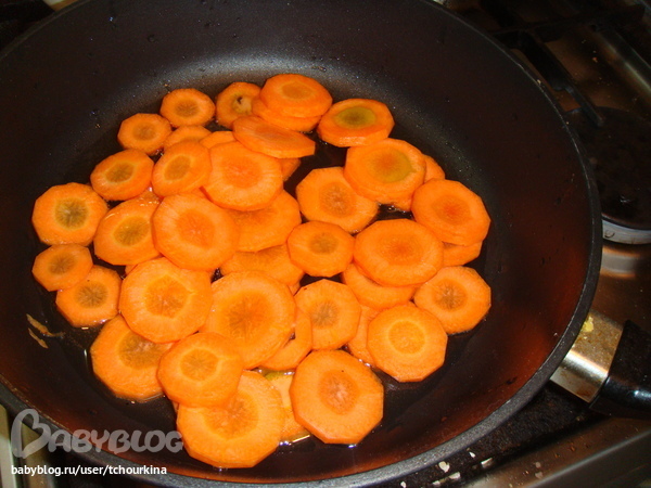 Сначала обжариваю до полуготовности кружочки морковки:
