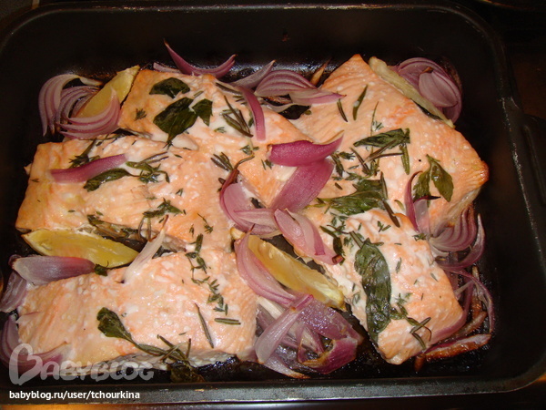 Филе форели на коже разложить в смазанной маслом форме, посолить, добавить свежую мяту, базилик, розмарин, красный лук и кусочки лимона с цедрой. Запекать в прогретой духовке 20 минут. Скушали с огромным удовольствием: