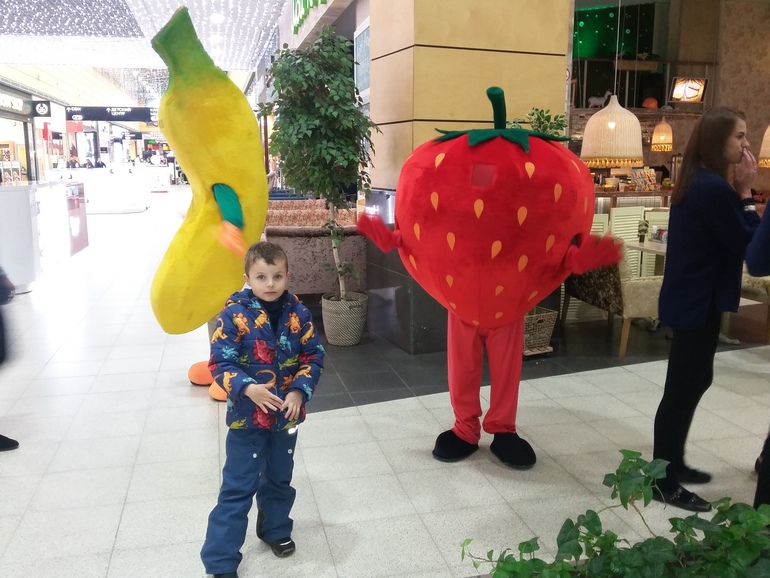 Были там еще и снеговик, брокколи, клубника. Они раздавали детям шоколадки, фоткались, играли. Вова наслаждается общением: