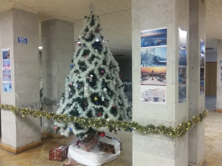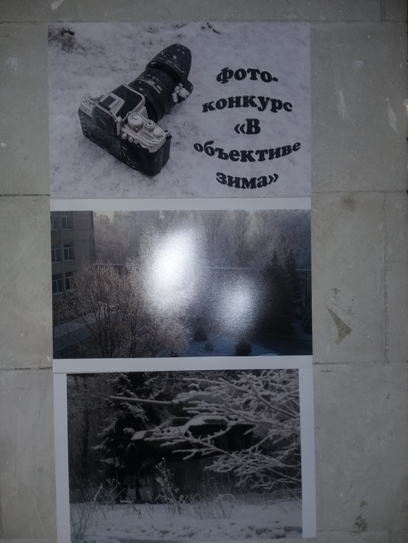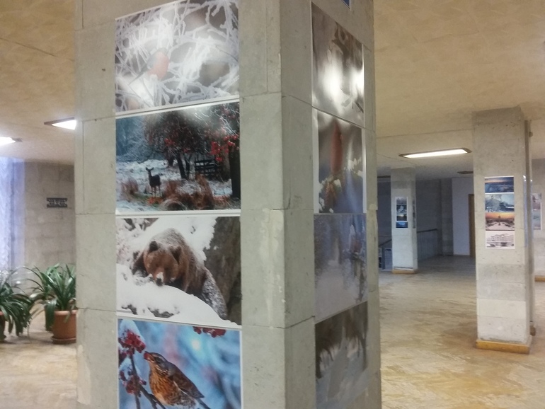 На всех столбах в фойе зимние фотографии: