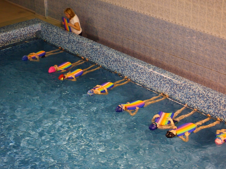 Вовуська увлекся звездными войнами. Купила ему меч Джедая. Растет! И отлично плавает (онв центре в голубой шапочке с картинками):