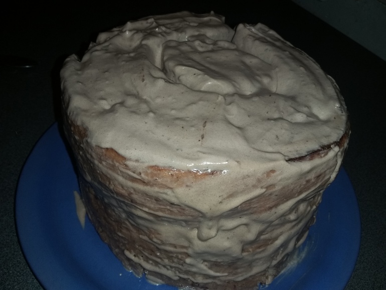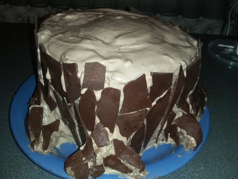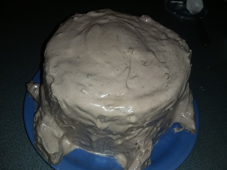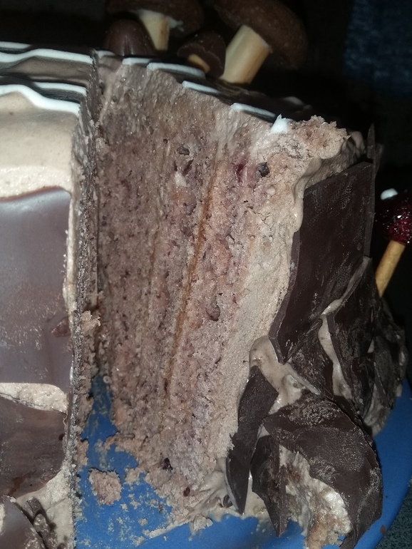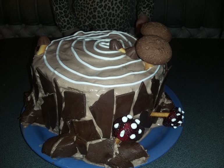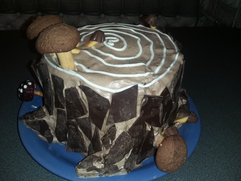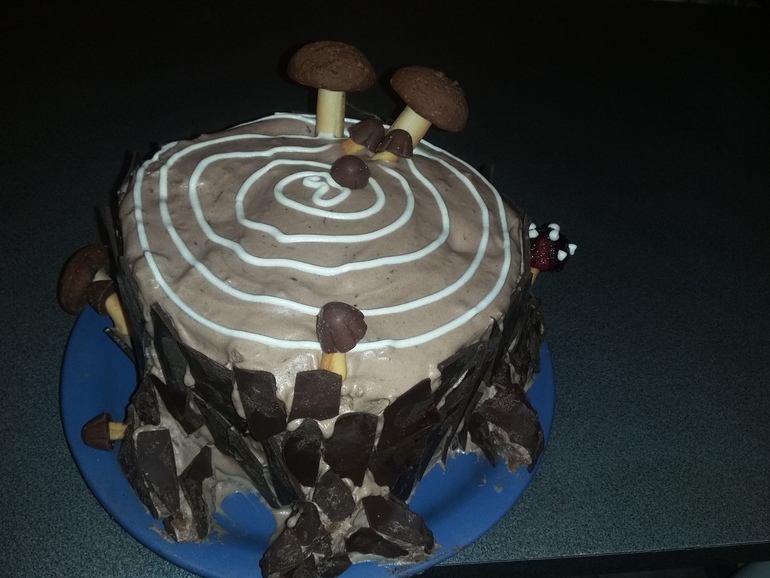 Нарисовать белым кремом годовые кольца. Вставить грибочки (на заднем плане всегда Кира - не отходила от тортика):