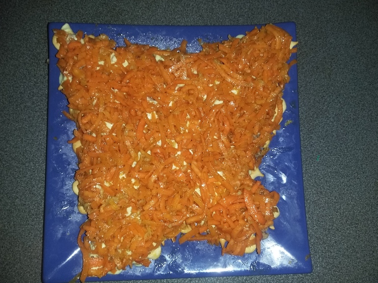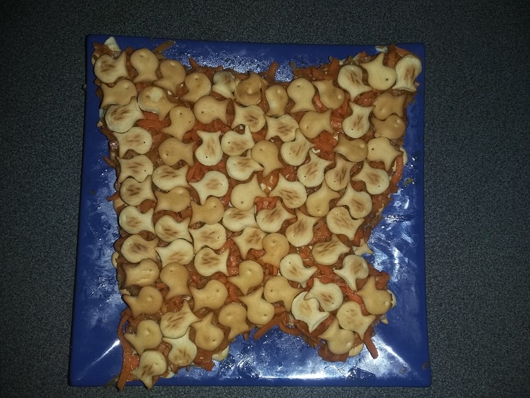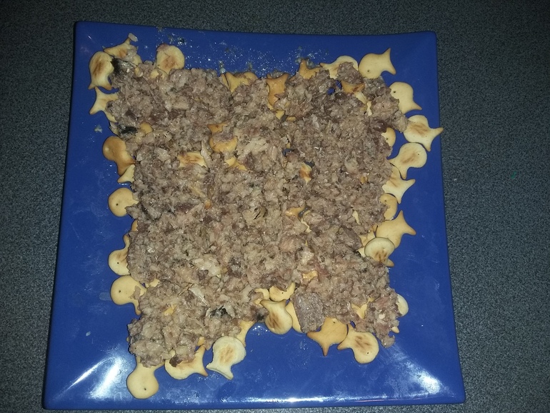 Сверху слой размятой рыбы в масле или в собственном соку: