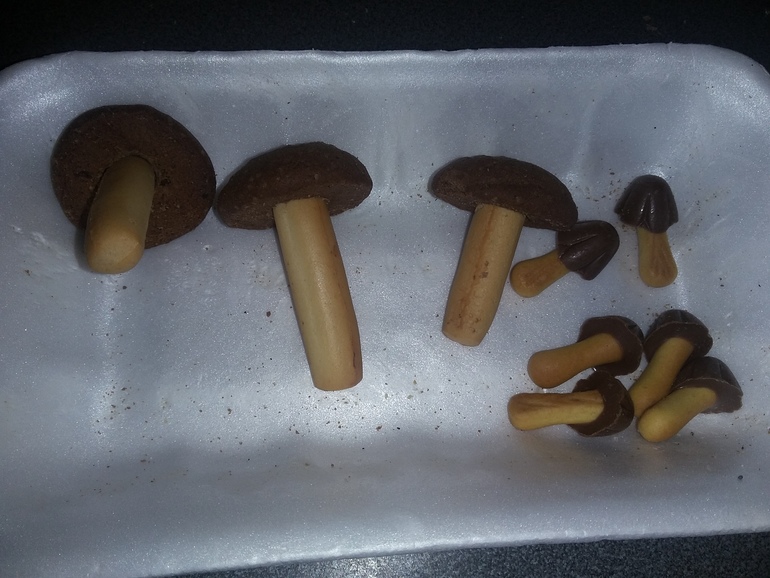 Склеить кремом печеньки и палочки, сделать грибочки. Маленькие грибочки - ЧокоПай: