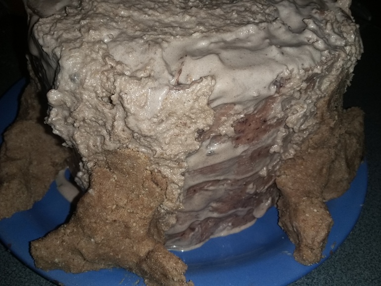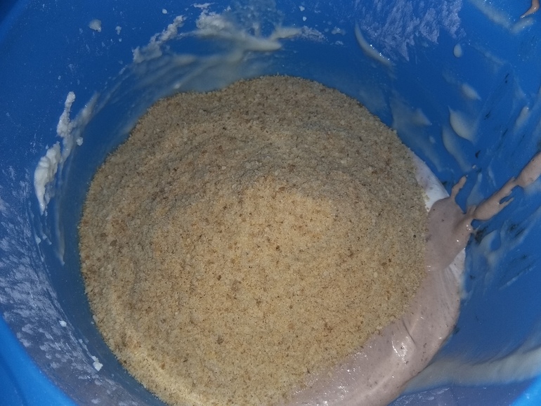1 стакан крема смешать с молотыми крошками (от печенья, бисквитов, палочек, пряников):