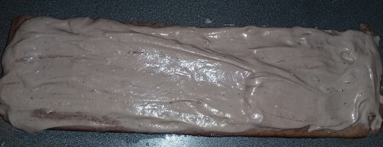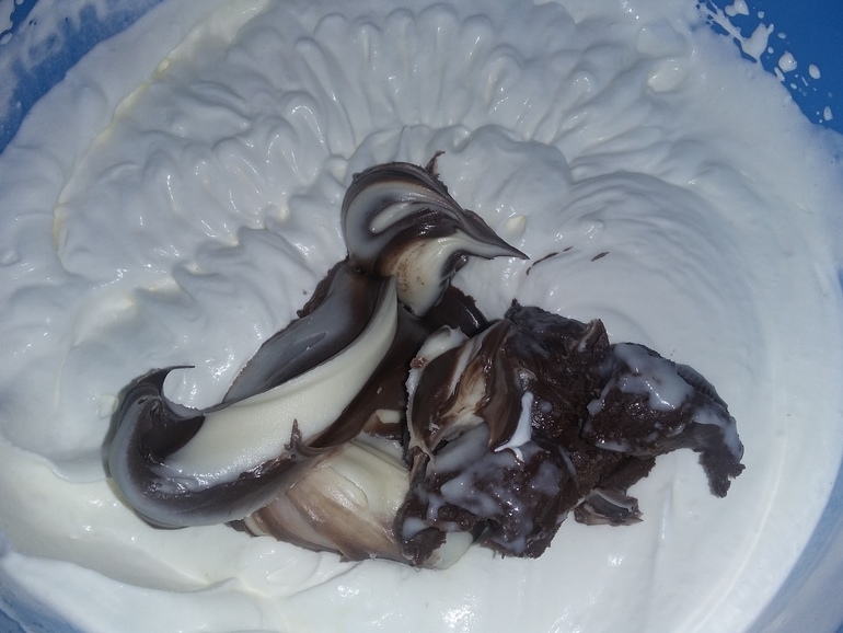 Постепенно добавить в сливки Маскарпоне. Отлжить немного белого крема для украшения. В оставшийся добавить шоколадную пасту и еще раз взбить::