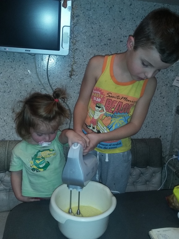 Всыпать 2,5 стакана муки и 1 ст.л. разрыхлителя: