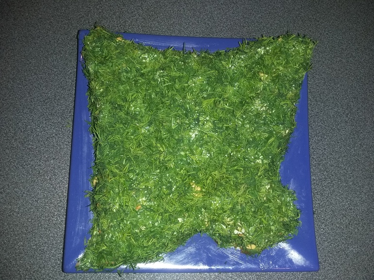 Свернуть все три полоски, наматывая друг на друга. Сформировать "пенек" и поставить его на подходящее блюдо вертикально: