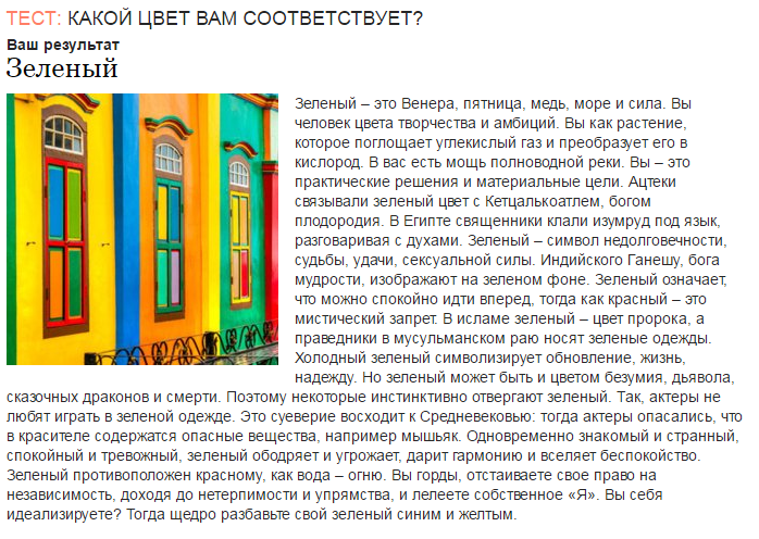Я тоже только что прошла, результат-зеленый))) как раз работаю над зеленым платьем для себя, мой путь к выбору зеленого был очень долгим, еще дольше искала тот оттенок ,что сама себе придумала, в итоге все складывается, а тест каким-то образом все подтвердил)