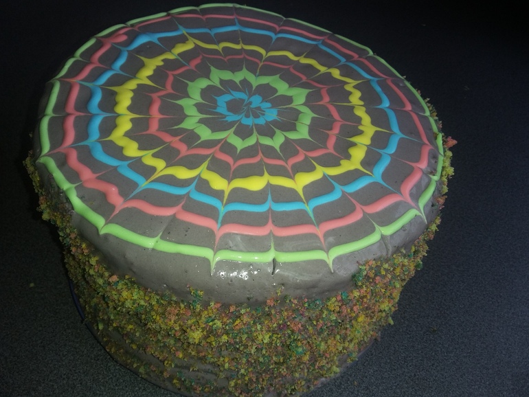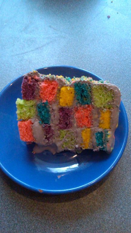 По просьбе внука придумала разноцветный клетчатый торт с серым слоновьим кремом.