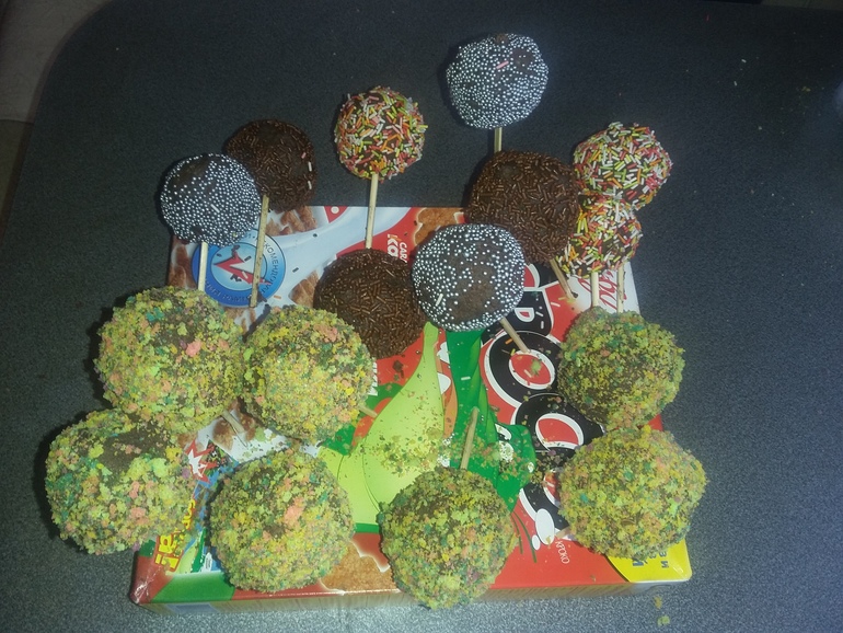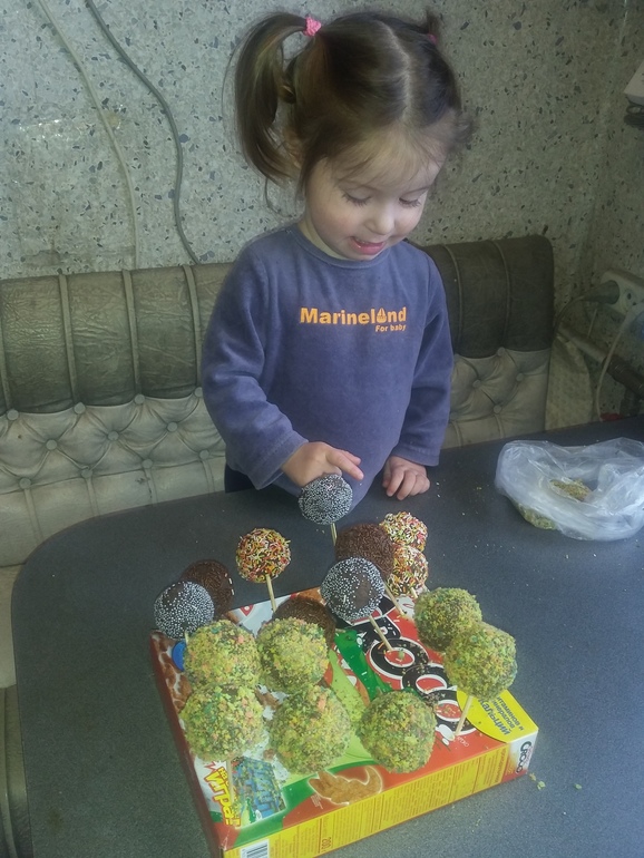 Коржи после выпечки обрабатывала теркой (снимала корочку снизу и с боков) и получила почти 2 стакана разноцветных крошек. Да и крем остался. Так что по просьбе внука сделала нечто а-ля кей-попсы.