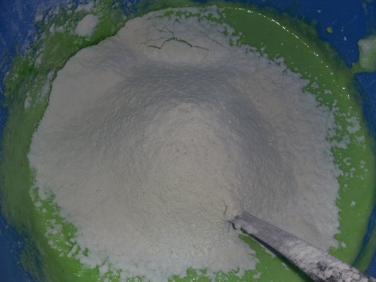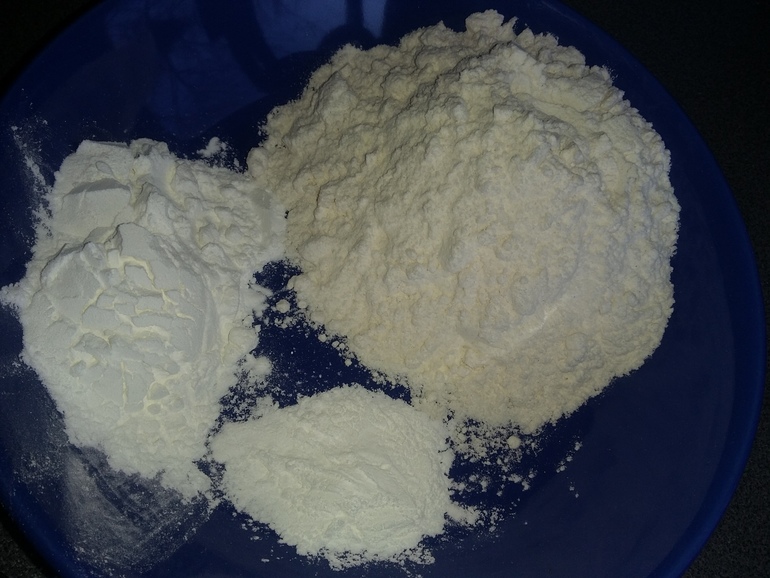 Смешать в отдельной посуде 5 ст.л. муки, 1 ст.л. крахмала, 1 ч.л. разрыхлителя: