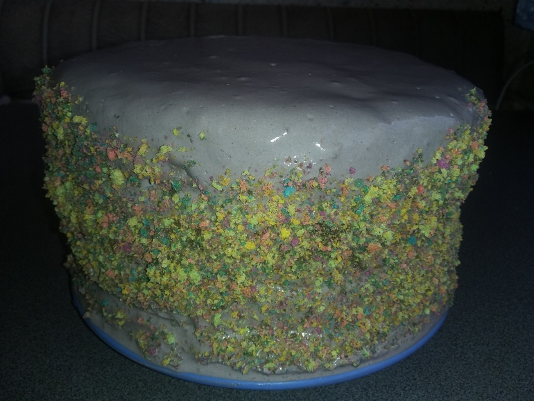 Сложить торт, перемазывая обильно коржи. Украсить бока бисквитными крошками от коржей: