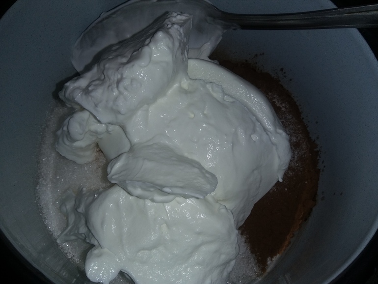 Смешать 5 ст.л. сметаны, 5 ст.л. какао, 8 ст.л. сахара: