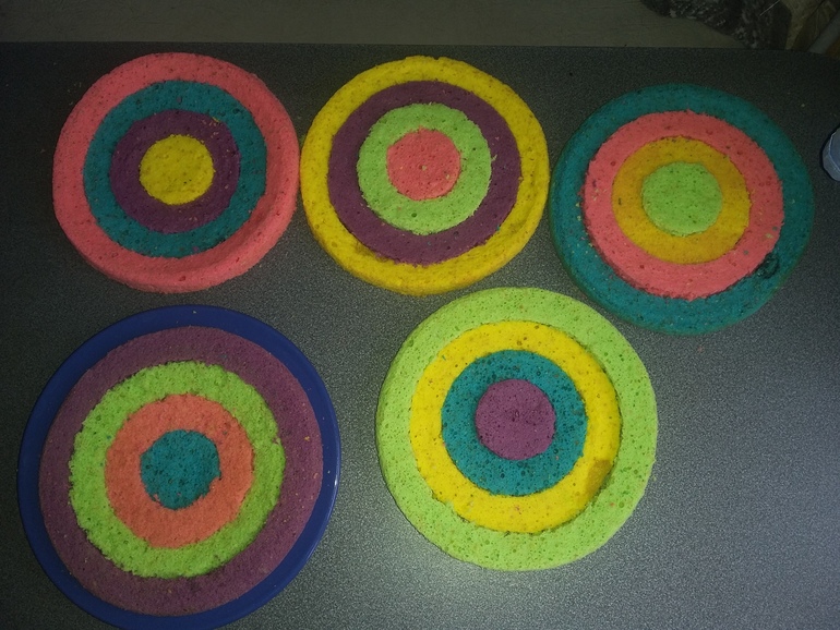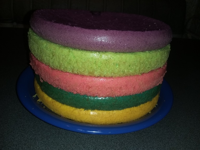 Понадобилось испечь 5 разноцветных коржей. Нормы продуктов привожу на ОДИН корж. Остальные делаются идентично, отличаются только цветом и ароматизатором:
