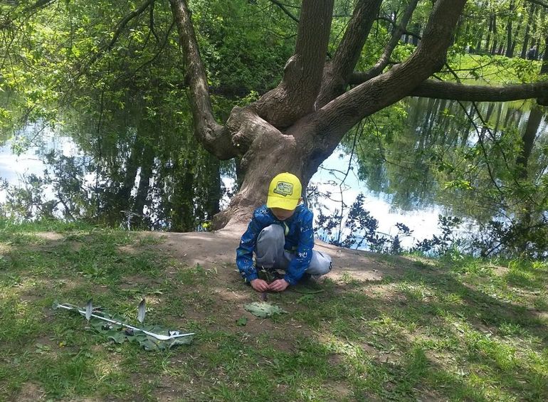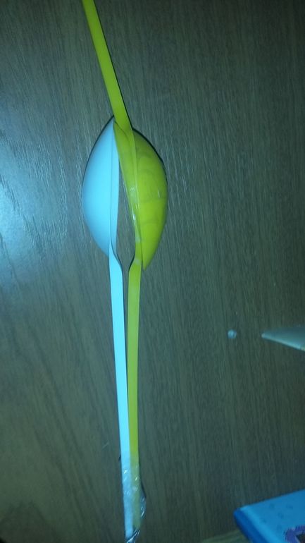 Придуманный Артемом звездолет из трубочки для шарика и ложек (лежит длинный белый на траве на фото вверху) мы модернизировали, чтобы не выпадал дроид: