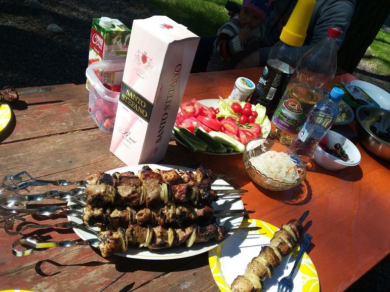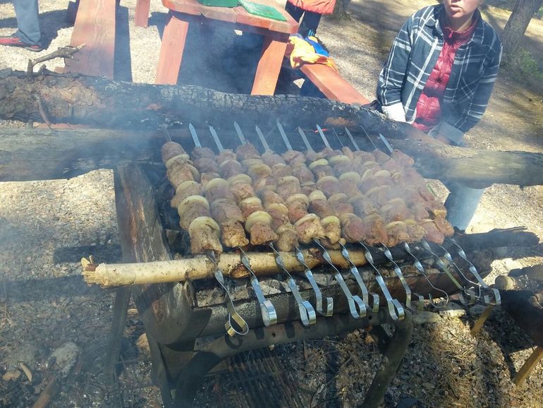 Были у нас и бараньи колбаски ручной работы, и рыбка в фольге, и курица в остром маринаде, и печеная картошка, и шашлыки (горячая еда на любой вкус):