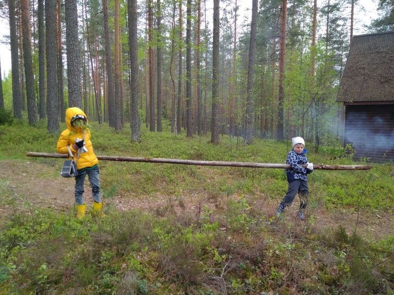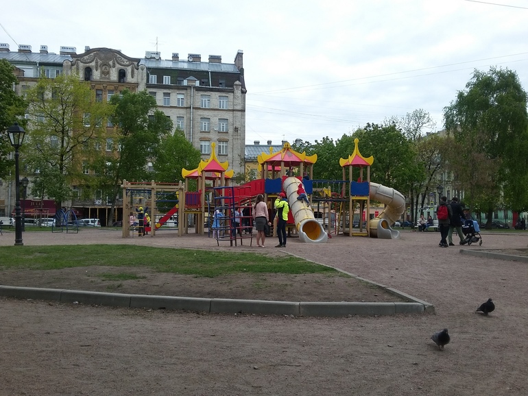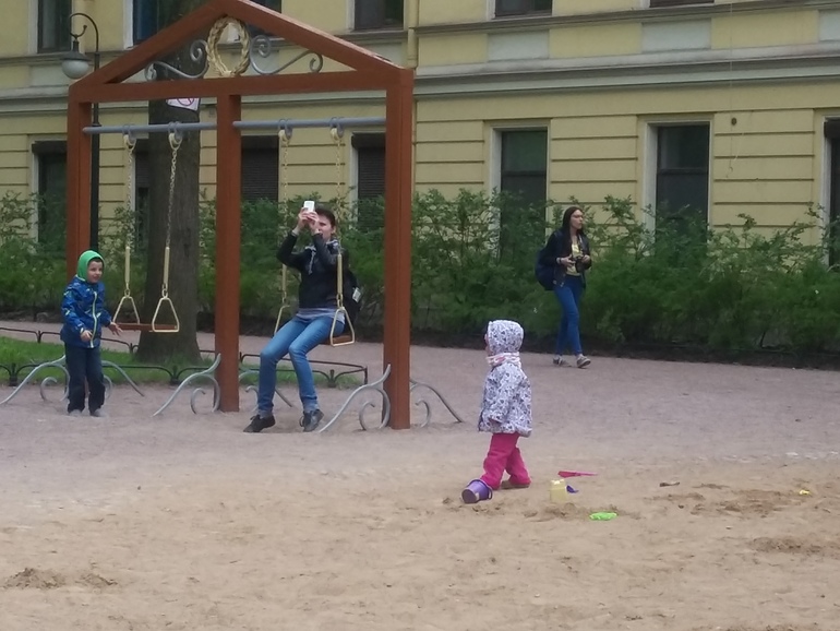 На Марсовом поле из гравия, песка и травы строили базу дроидов и зависли в ней на пару часов, пока мы не замерзли на скамейке: