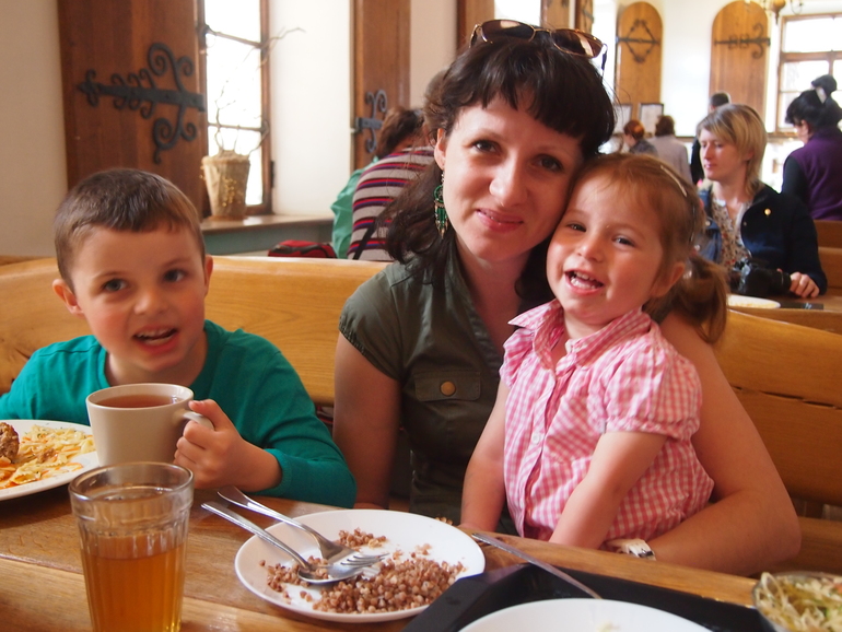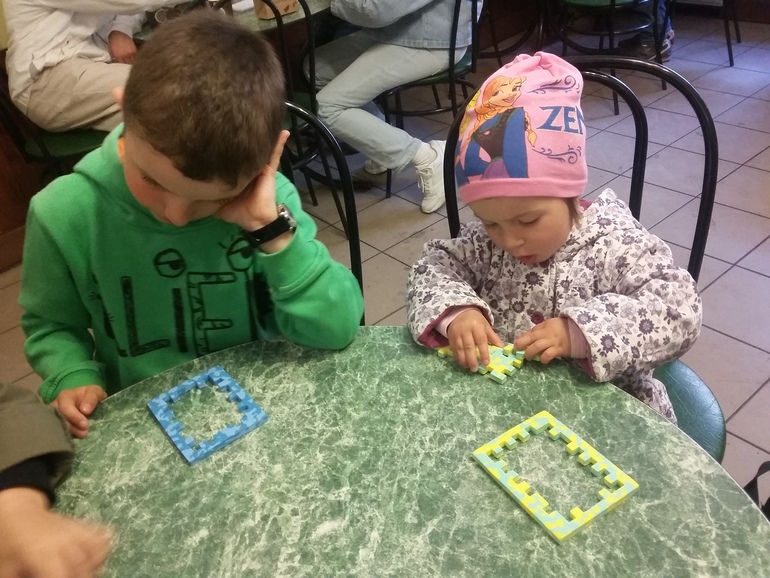 Поели пышек у Финляндского вокзала. В их ожидании Вова с Кирой собирали головоломки. И у Киры неплохо получается - любит пазлы: