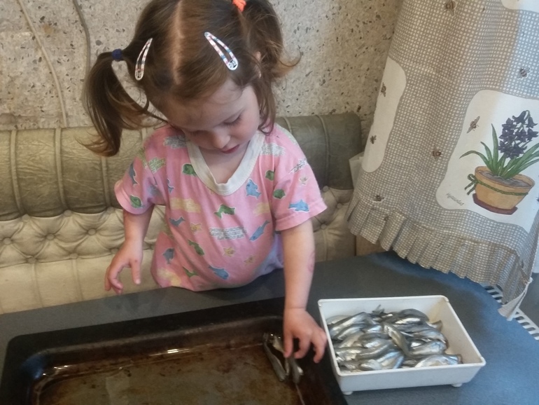 Кира помогает готовить - укладывает корюшку на противень для запекания: