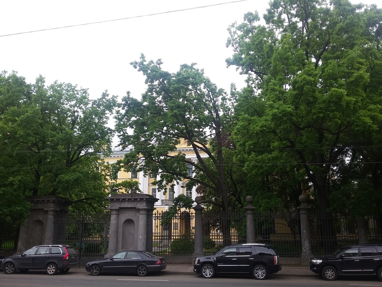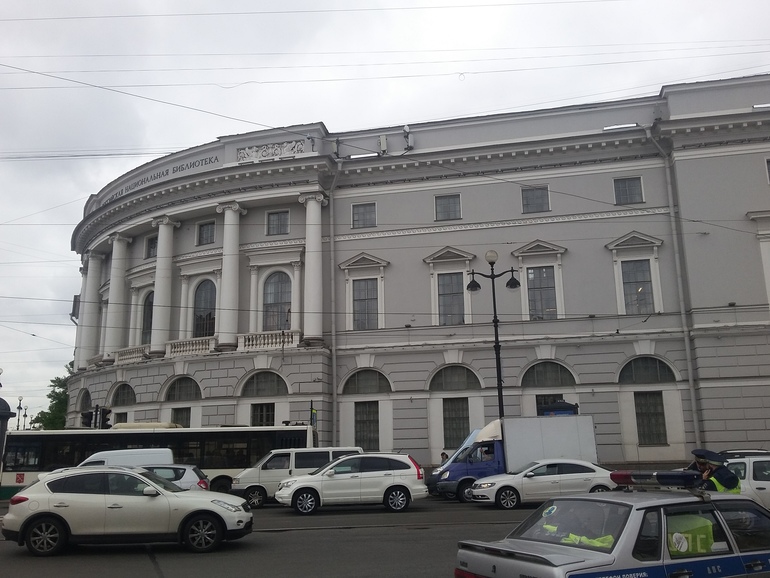 Налево здание Думы и Дом книги, направо Российская национальная библиотека: