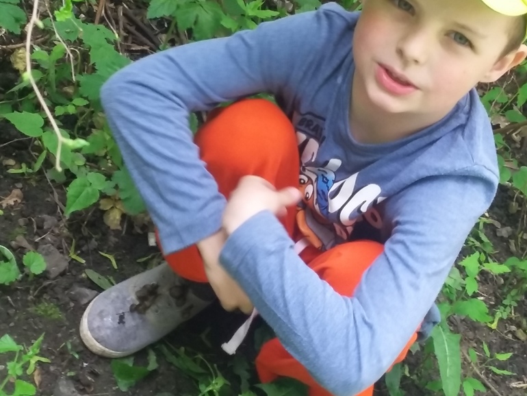 К этому занятию Вова и Киру пристрастил - тоже собирает их, рассматривает играет. Благо искать их не надо - ползают почему-то у нас по кустам: