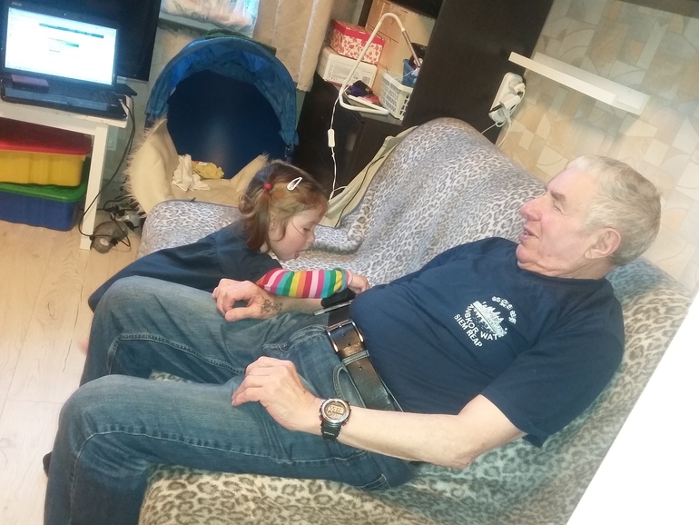 И прадедушка (мой папа) с удовольствием болтает с Кирой (и понимают, вероятно, друг друга):