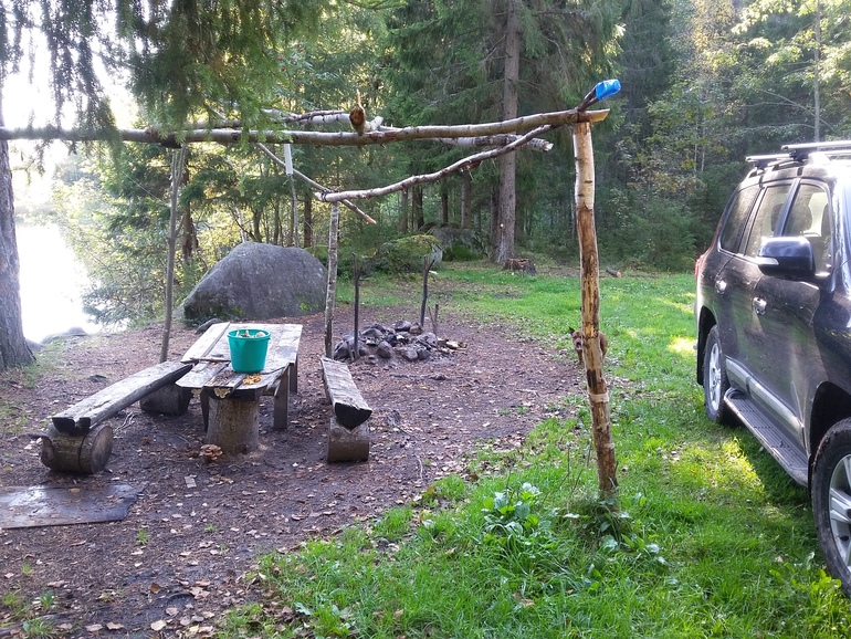 Останавливаемся в этом лесу в разных местах. И делаем пробные вылазки - смотрим что за лес и что в нем есть? В этот раз нашли прекрасную полянку, на которой есть и родник, и озеро, и хорошая стоянка, и рубленый стол с навесом: