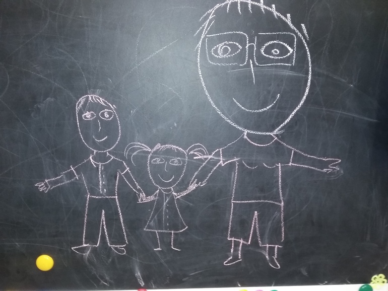 Получается не очень. А вот на доске рисовать любит. Сначала она рисует овал или "кадат" (квадрат), потом просит меня дорисовать из этого что-нибудь (чаще всего человека, солнышко, машину или домик). Вот такие картины у нас бывают: