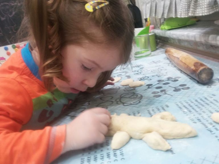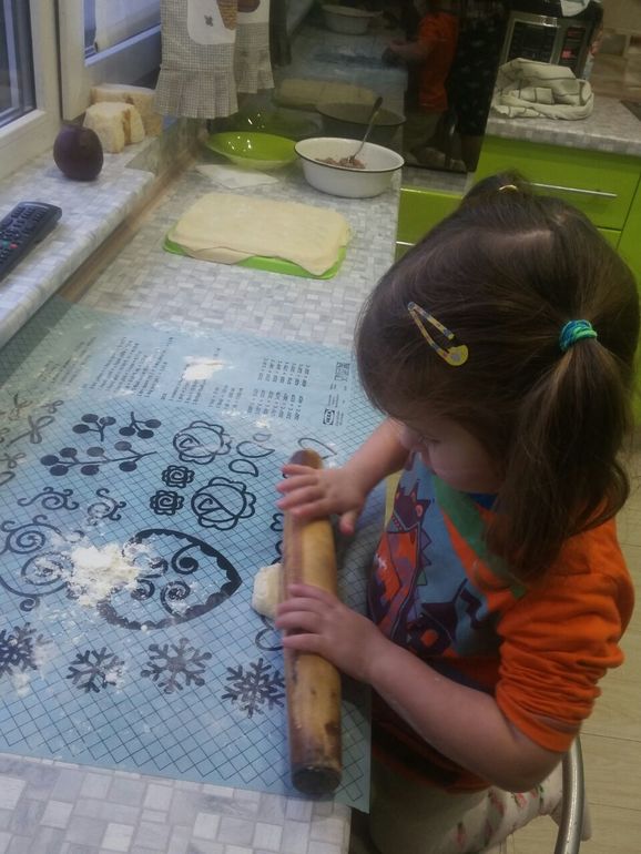 Собирает бесконечное Лего. Помогает мне готовить. Вот вместе с Кирюшей они наделали сухариков/печенек: