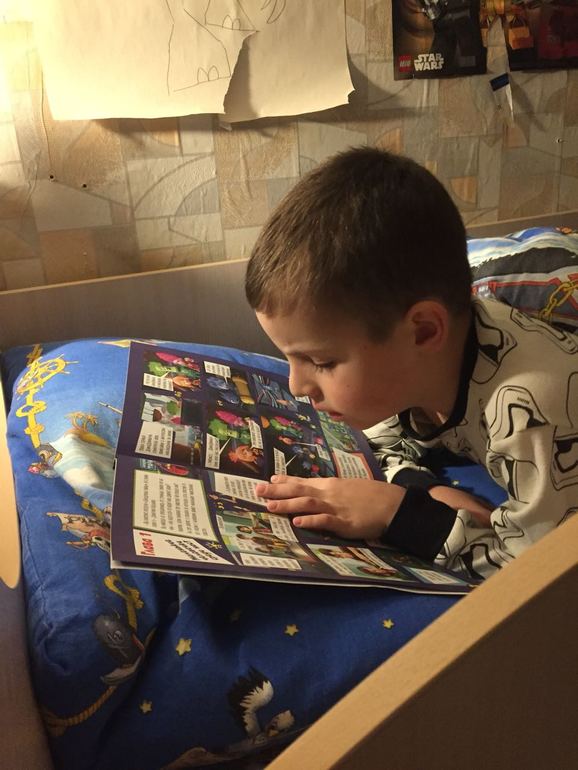 Дважды уже Вова посмотрел новый мульт про Фиксиков. Купили сначала раскраску, теперь толстую книгу комиксов про них. Не расстается с ней: