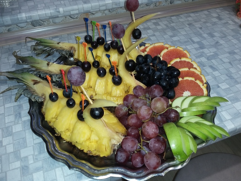 На горячее была свинина по-кремлевски. Была и фруктовая тарелка: