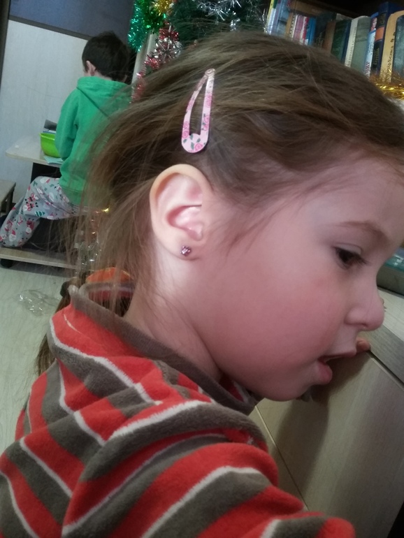 Ох, и плача было! А потом еще сережка выпала и она никому не давала вставлять. Купили другие, любимый воспитатель в садике поменяла.