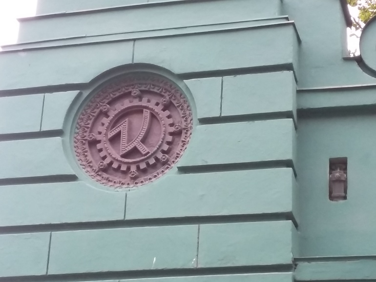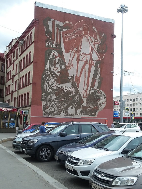 В конце площади огромный брандмауэр (глухая стена дома) с пролетарским рисунком: