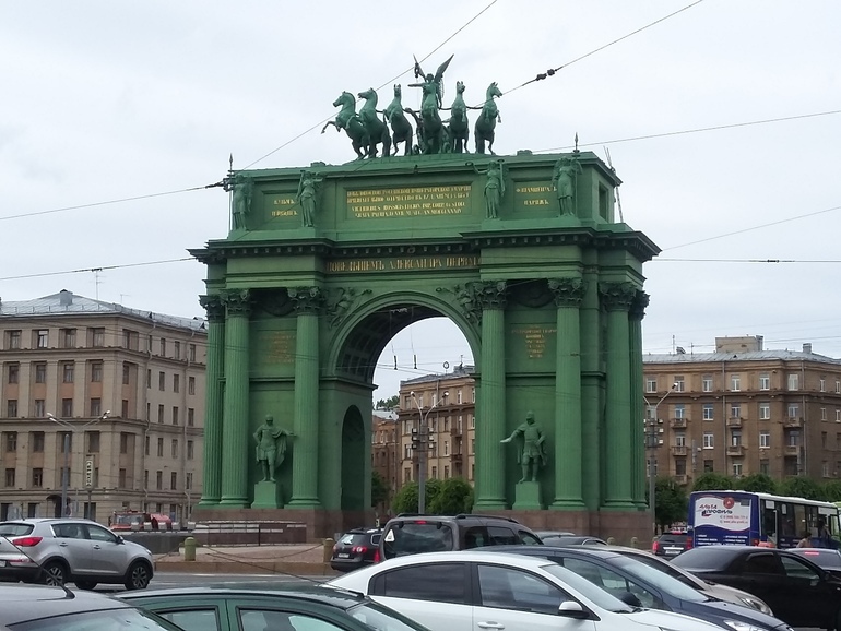 Перед ней на площади Стачек стоят Нарвские триумфальные ворота, они посвящены победе русских войск над армией Наполеона и были возведены в Санкт-Петербурге специально для парада гвардейских полков, возвращавшихся после окончания войны 1812 г.: