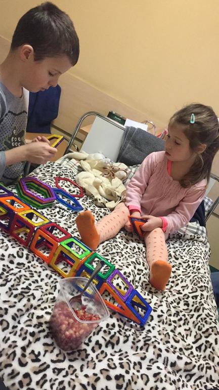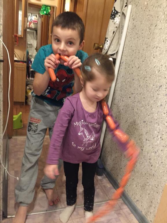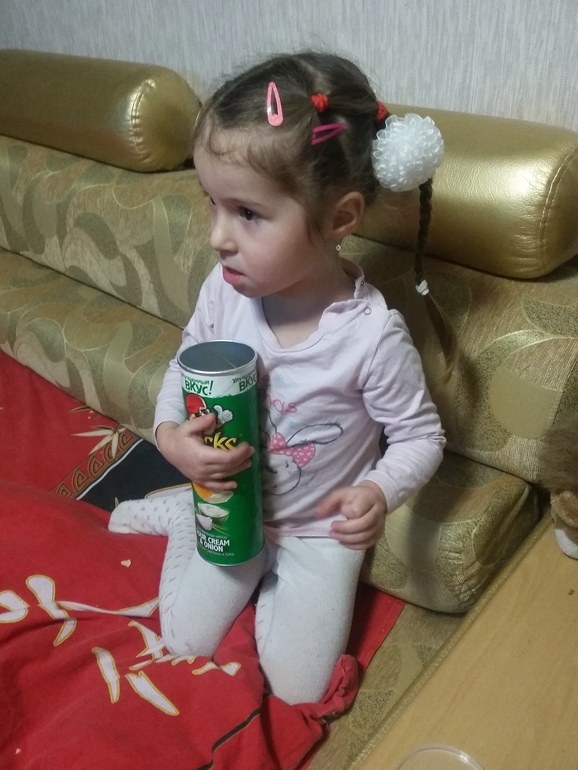 В самом конце декабря опять затемпературила Кирюша. Ну что за напасть? Так жаль малепуську: с температурой 39 она лежит тряпочкой рядом с мамой и ничего ей не интересно. Но, когда температура спала, сразу стала спорить со старшим братом и испытывать границы его терпения. Вот под шумок его чипсы утащила: