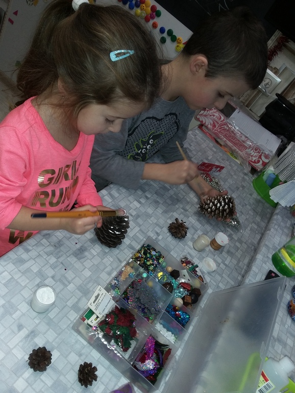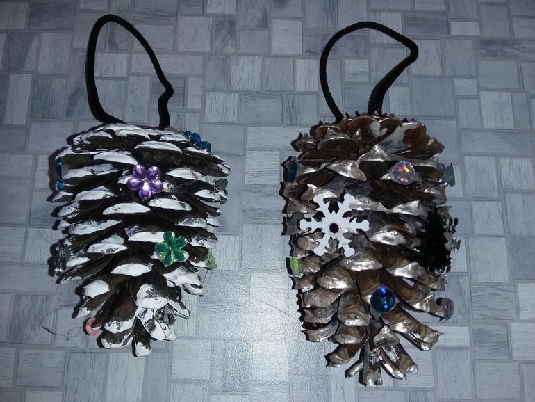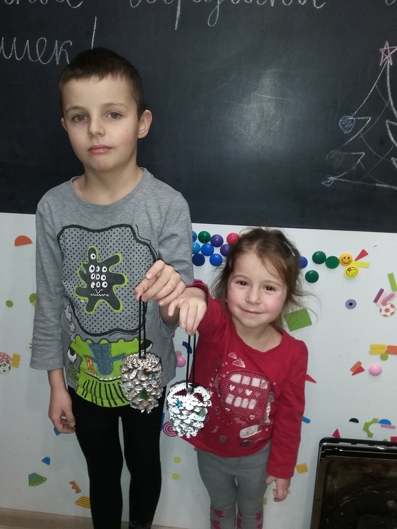 Еще мы с ними делали ёлочные игрушки из кедровых шишек: