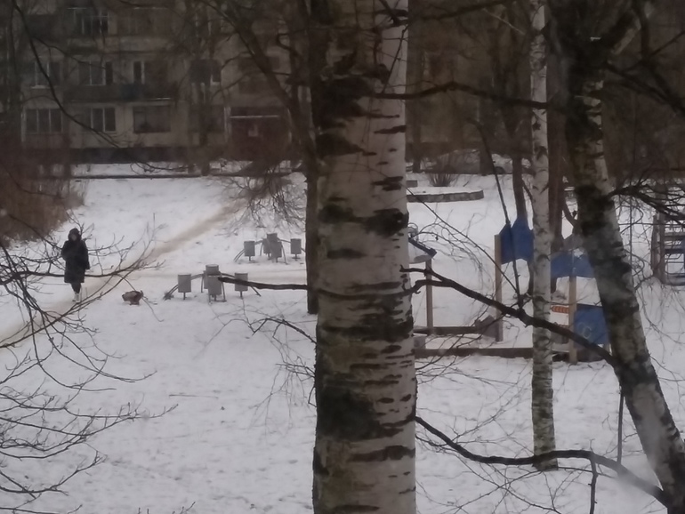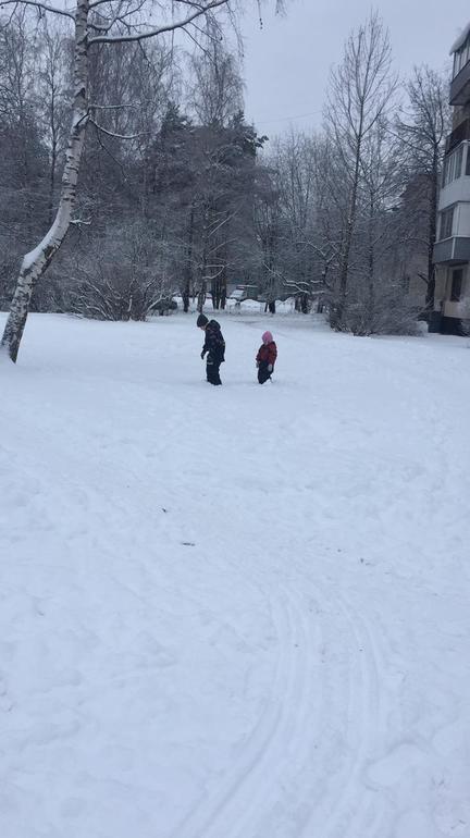 29 декабря у нас первый раз сбивали сосульки с крыши дома. Вообще, в этом году отлично убирают снег. Дорожки просто вылизаны все! А снега на площадке много, но кроме нас гуляющих не видно:
