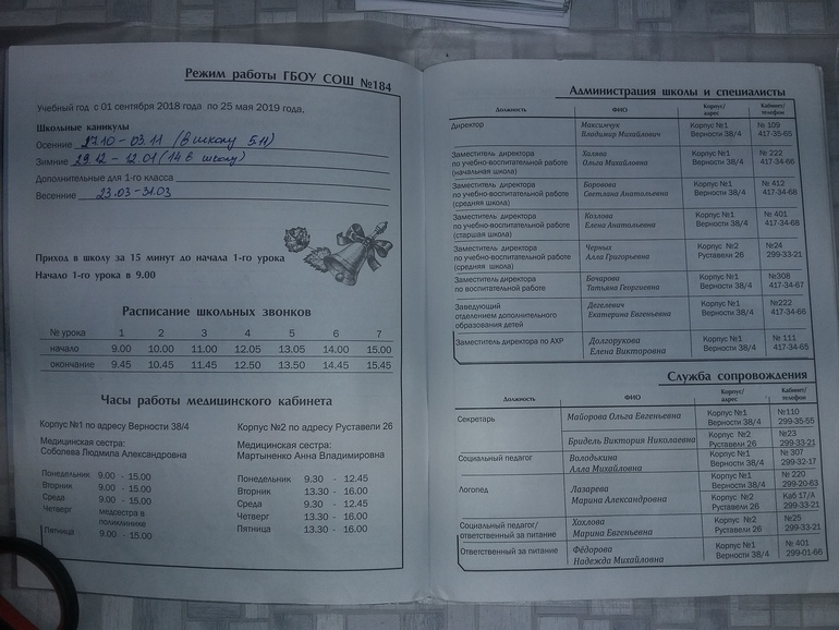 Все нужные фамилии и телефоны указаны. И расписание школьных звонков (вернусь к этому в конце поста):