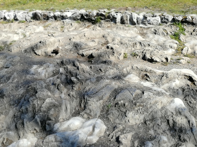 Хорошо видно, как пробивали в породе шурфы, чтобы потом заложить в них взрывчатку и отколоть мраморные глыбы: