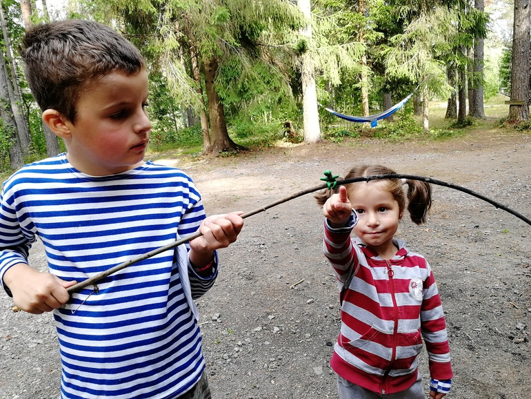 Сделали из ветки удочку, из пробки с перышком поплавок и пошли рыбачить: