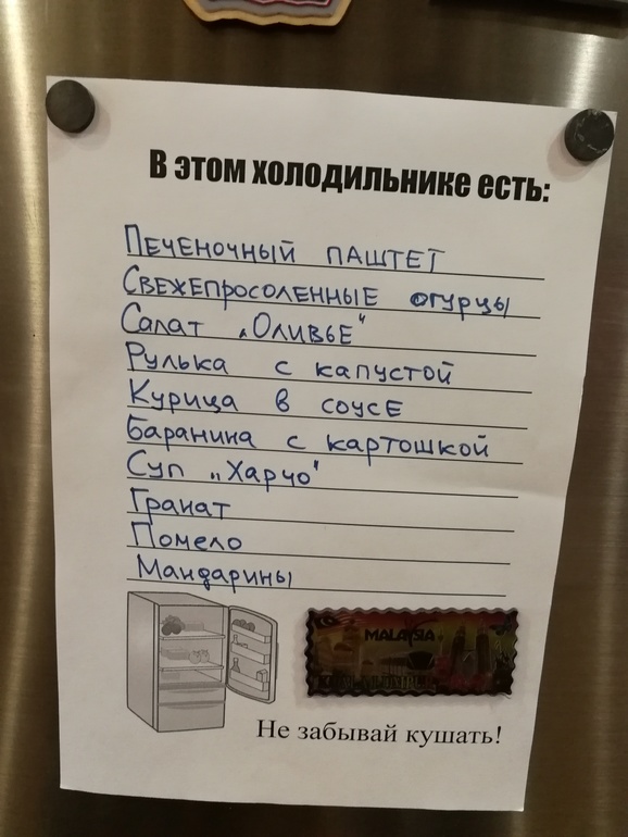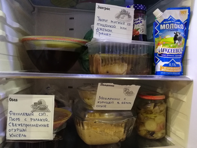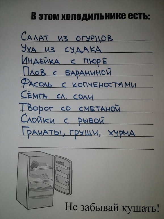 Правда, брату эта затея не понравилась. Он считает что так папа совсем перестанет задумываться. Ну, не знаю. Мне так спокойней - я уверена, что папа точно поест, а не упадет опять в голодный обморок со своей зашкаливающей кислотностью и вырезанными 3/4 желудка из-за язвы. Пришла к компромиссному варианту - написала папе на дверце холодильника большую записку: