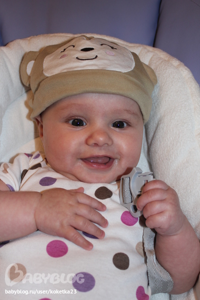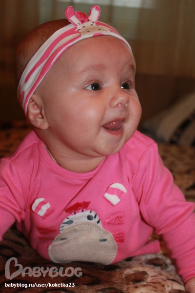 Ну и на последок о хорошем.Научились переворачиваться на живот в 4 мес. и 20 дн, теперь верится как волчок, правда обратно еще не научилась. Будем осваивать полы, т.к. боюсь после всех историй падений ее оставлять на диване, ждем коврик для ползанья. Да кстати пытается ползти, вокруг себя и немного вперед и назад уже получается. Болтаем с каждым днем все больше и больше. Когда слышу от нее ма-ма, то аж сердце замирает, жаль что это пока не осознанно, а звуковой ряд большой уже и баба, и папа, ну конечно всякие кхе-кхе, ау, агу, гуа и т.д. Все также поет забавно во время купания, еще иногда поет себе так а-а-а, как-будто убаюкивает себя, на улице это оч. забавно выглядит:))) Любит свое отражени в зеркале и трогать зеркало,т.ч. у нас везде маленькие ладошки теперь! Улыбается уже осознанно, оч. радовалась, когда мы гостили у моих родителей, когда бабушка и дедушка с работы возвращались, улыбалась во все свои 32 потенциальных зуба. Интересно, когда ни у нас появятся...У меня кстати, по маминынм словам, в 5месяцев было подобное поведение, но зубы вылезли аж в 10!!!!