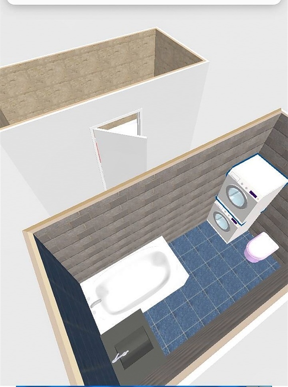 Ванна не влезет не вдоль комнаты, а поперёк? Может быть лучше поменьше взять, но всунуть именно так? Неправильно она стоит. Открытый край должен быть только один и на него вешать шторку или перегородку, а у вас два края открыты, бок и "ноги" - и не закроешься толком и брызги будут лететь. Рядом нудо будет раковину поставить и если у вас сушка со стиралкой разьединяются, то поставить их не один на другой, а оба на пол рядом с раковиной и накрыть всё это дело большой столешницей.