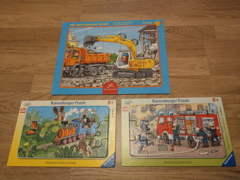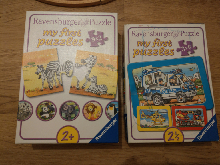 Это паззлы-провалы у нас))) слева я купила давно уже, но Тим просто каждый раз открывал коробку, смотрел на них, и закрывал)) сейчас ради разнообразия складывает, зверей обсуждаем. Справа я купила вот точно перед тем, когда Тим начал складывать сам паззл из 15ти, и соответственно это уже было сильно легко. Только транспорт на картинках спас немного ситуацию, иначе бы вообще забросили.