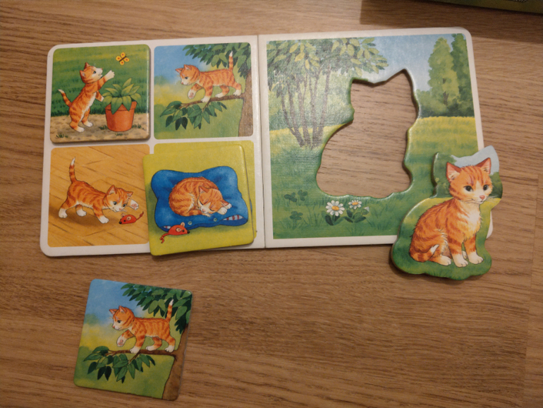 Начинали с левой еще до двух лет по-моему, очень толстый картон, милые животные. Нужно соотнести правильно картинки. Тим уже выростает из этой игры, используем больше для словарного запаса, обсудить действия животных.