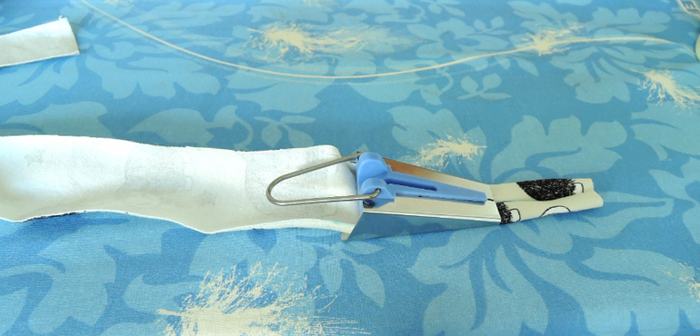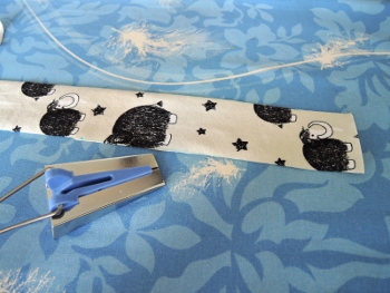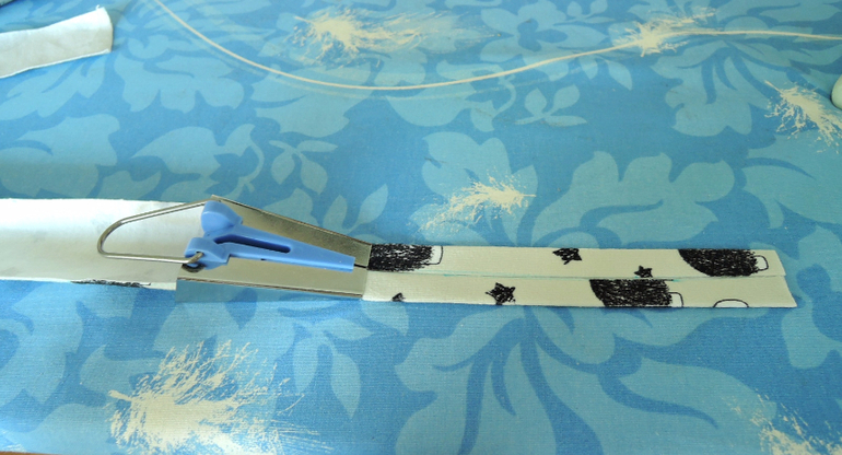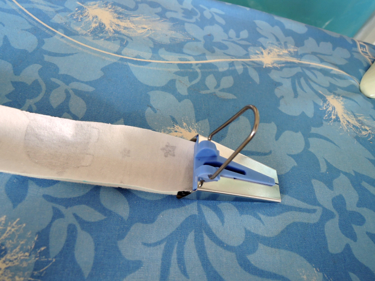 Есть вот такая классная штука, не знаю, как это зовут по-русски, а на немецком Schrägbandformer. Купила недавно, чтобы делать себе косые бейки для детской одежды. Сегодня был первый опыт с ним. Очень довольна.