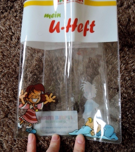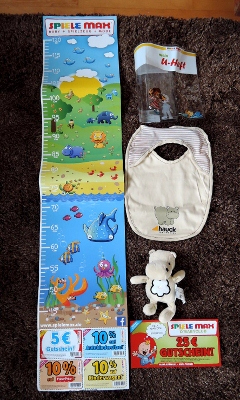 В преддверии Нового года решила зарегистрироваться на всяких сайтах и получить подарочки для беременных. Если в Rossmann и DM пригодилась в основном упаковка - тоесть зеленая сумочка для ванных принадлежностей в Rossmann и войлочная папка для документов из DM, остальное это всякие скидочные купоны, советы и пробники. То в SpieleMax сам подарок внутри пакета мне понравился больше всего.