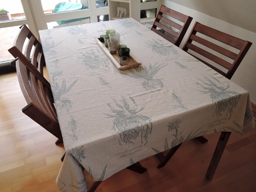 В прошлом кухонный стол стал столом в гостинной, но мне не нравится, что у него стеклянная поверхность, поэтому задумалась о плотной скатерти, которая бы вписывалась в нашу гостинную. Наличие ботанического сада рядом натолкнуло меня на растительную тему и очень вовремя под руку попалась интересная ткань из онлайн магазина