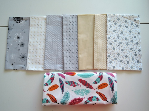 Узнаете мою любимицу с перьями?) решила взять еще, пока они не убрали ее совсем из ассортимента. И взяла спокойный набор для бортиков в кроватку (если я их успею сшить вообще). Это наборы для пэчворка, хлопок, 7 расцветок размером 30 на 75 см.